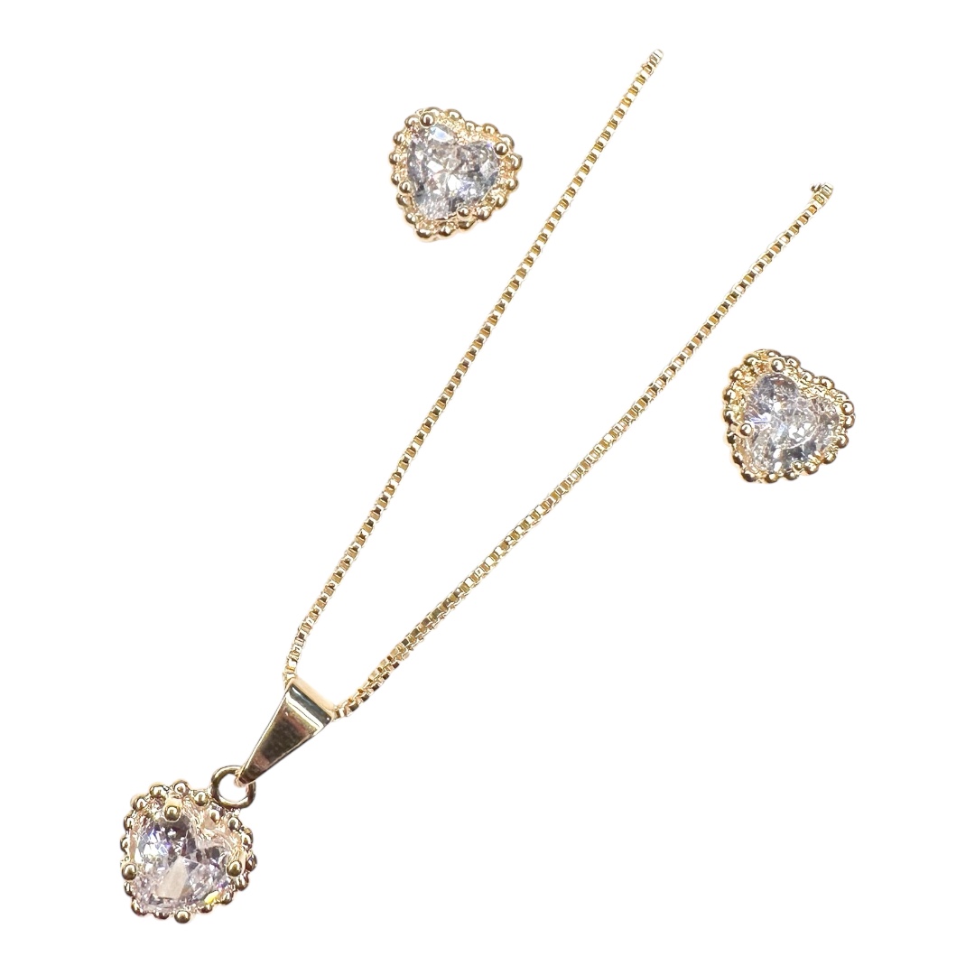 Apresentamos nosso encantador conjunto de brinco e colar delicado em formato de coração, adornado com esferas, com zircônia cristal. Essa coleção reflete amor e elegância, perfeita para realçar sua beleza em qualquer ocasião. Com um design sofisticado e brilho radiante, esse conjunto é ideal como um presente especial ou para se permitir um toque de glamour.